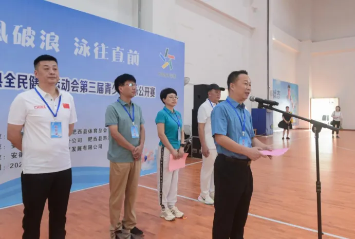 8月20日上午,2024年肥西县全民健身运动会第三届青少年游泳公开赛在县全民健身中心举行。肥西县政府督学王军、肥西县教体局体育科科长丁波、肥西游泳协会会长解启田、安徽冠深公司肥西分公司总经理朱俊鹏等出席开幕式。