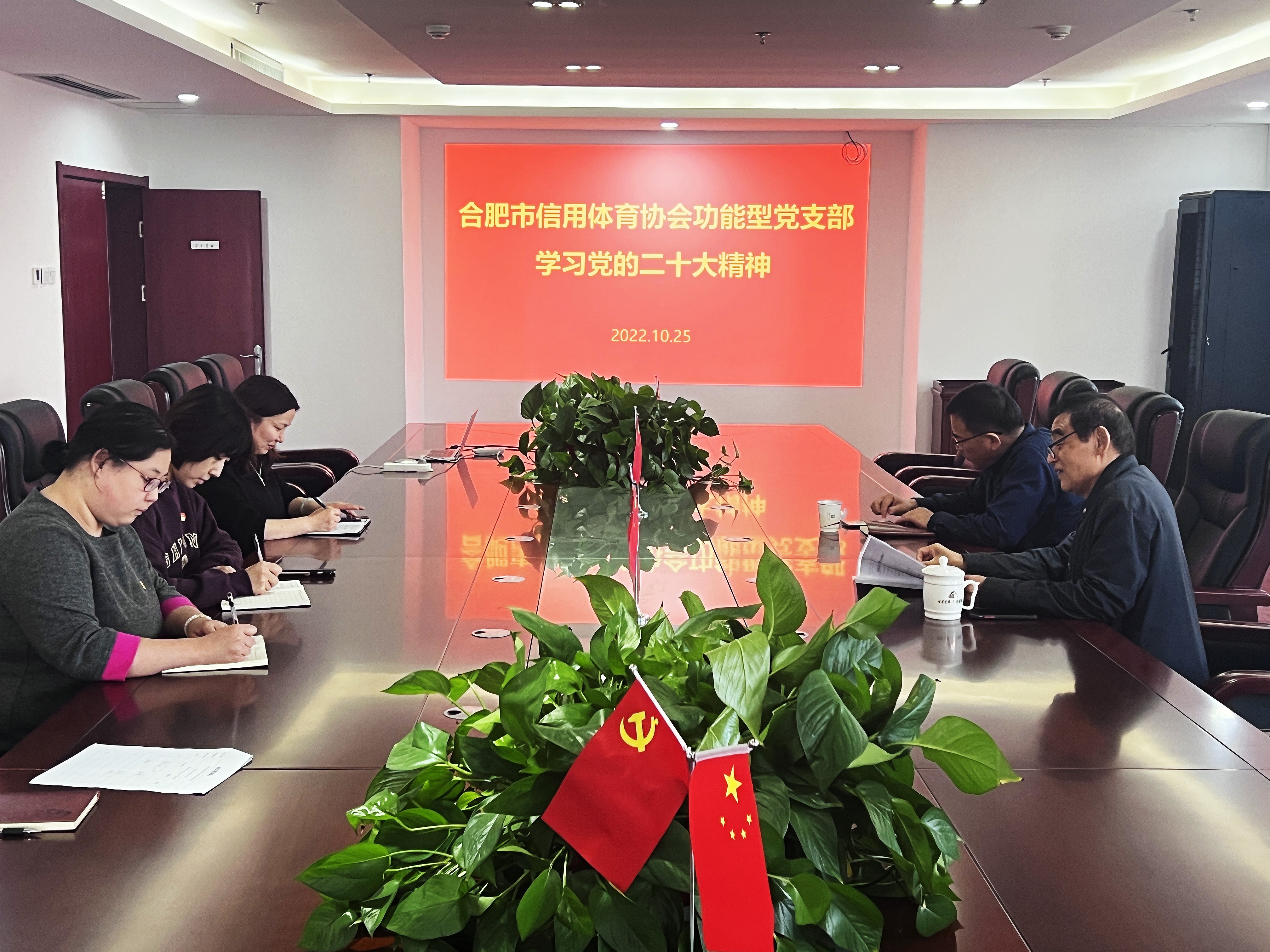 10月25 日下午,合肥市信用体育协会功能型党支部开展党员活动日活动,专题学习党的二十大报告精神。协会功能型党支部书记陆忠敬主持会议,市全民健身中心主任、信用体育协会会长张峰,副会长兼秘书长崔荣花及协会秘书处全体工作人员参加学习。