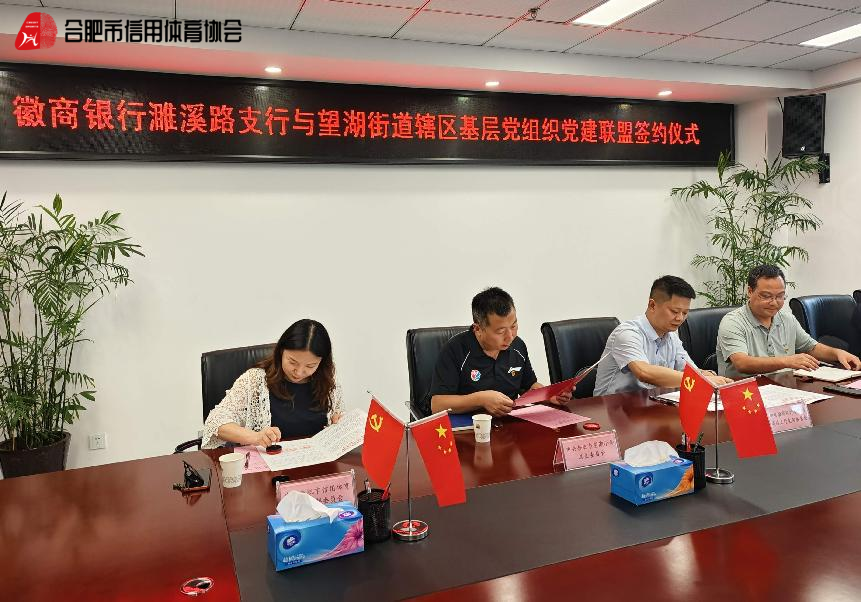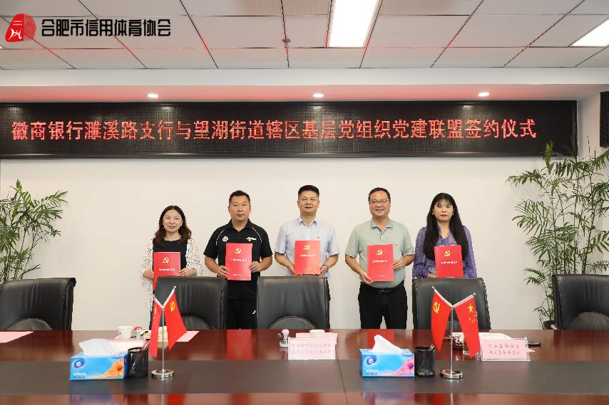 为充分发挥党建引领作用,构建“互学互促、优势互补、资源共享、融合发展”的党建工作新格局,不断增强党组织的创造力、凝聚力和战斗力。9月28日,中共合肥市信用体育协会功能型党支部与中共包河区望湖街道机关支部委员会、中共徽商银行合肥濉溪路支行支部委员会、中共合肥市望湖小学总支委员会、中共合肥兴水建筑水电安装工程有限公司支部委员会共同举行“党建联盟共建”签约仪式。