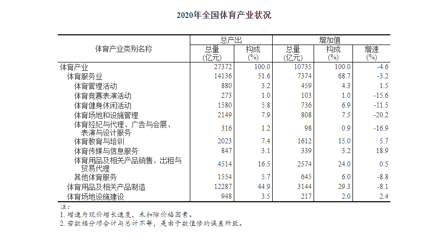 从增长速度看,受新冠肺炎疫情影响,多数体育产业类别增加值出现下降,其中,体育场地和设施管理增加值下降20.2%,体育经纪与代理、广告与会展、表演与设计服务下降16.9%,体育用品及相关产品制造下降8.1%。