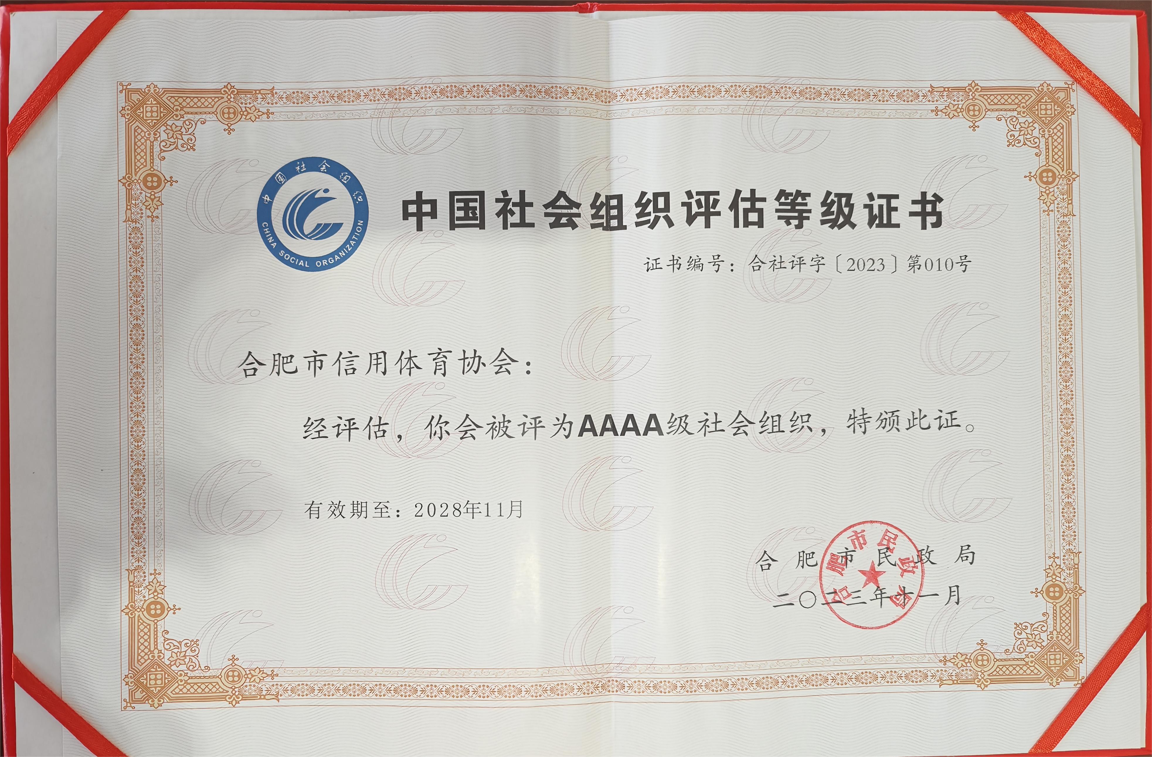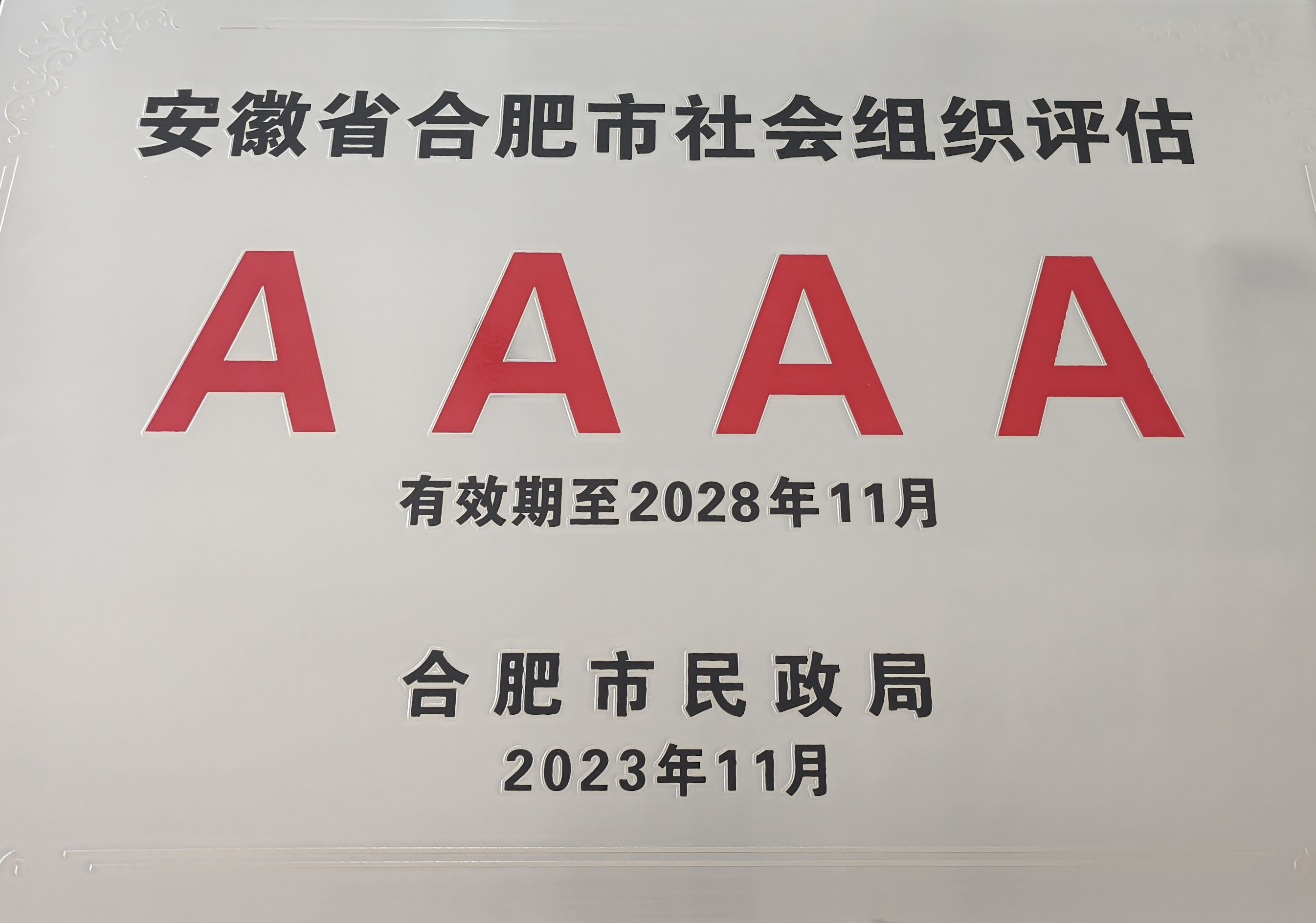 根据《关于开展2023年市级社会组织等级评估工作的通知》(合民管〔2023〕10号)和《合肥市社会组织评估管理办法》(合民〔2014〕282号)的相关工作要求,经社会组织参评报名、资格审核、实地考察、评估委员会评审及公示等步骤,我会荣获“4A级社会组织”称号。